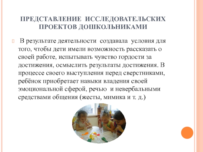 Слайд 9ПРЕДСТАВЛЕНИЕ ИССЛЕДОВАТЕЛЬСКИХ ПРОЕКТОВ ДОШКОЛЬНИКАМИ
