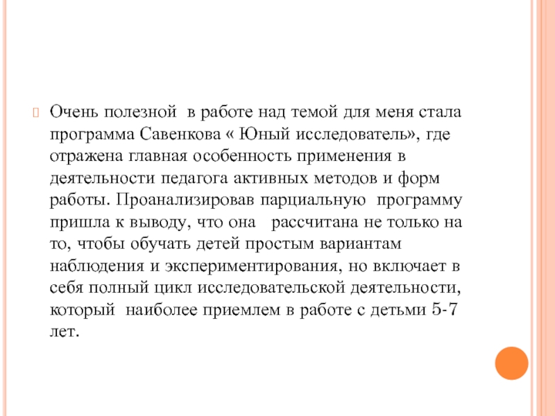 « Юный исследователь», где отражена главная особенность применения в деятельности педагога активных методов и форм работы. Проанализировав парциальную программу пришла к выводу, что она рассчитана не только на то, чтобы обучать детей простым вариантам наблюдения и экспериментирования, но включает в себя полный цикл исследовательской деятельности, который наиболее приемлем в работе с детьми 5-7 лет.