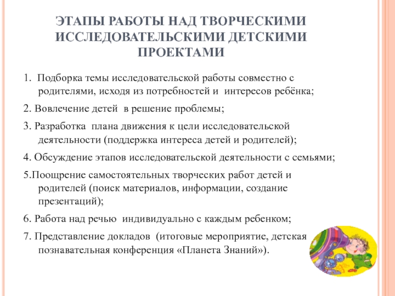 Слайд 7ЭТАПЫ РАБОТЫ НАД ТВОРЧЕСКИМИ ИССЛЕДОВАТЕЛЬСКИМИ ДЕТСКИМИ ПРОЕКТАМИ