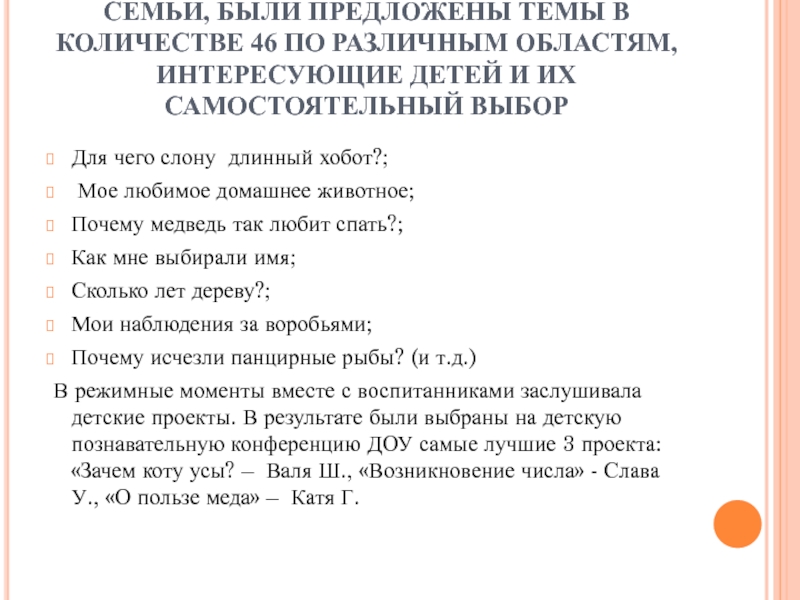 В режимные моменты вместе с воспитанниками заслушивала детские проекты. В результате были выбраны на детскую познавательную конференцию ДОУ самые лучшие 3 проекта: «Зачем коту усы? – Валя Ш., «Возникновение числа» - Слава У., «О пользе меда» – Катя Г.
