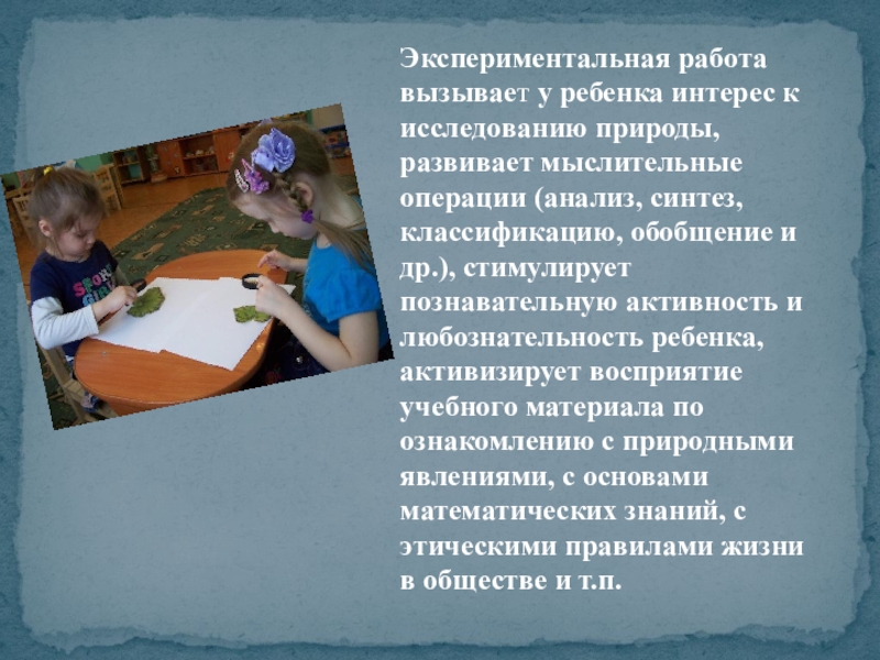 Экспериментальная работа вызывает у ребенка интерес к исследованию природы, развивает мыслительные операции (анализ, синтез, классификацию, обобщение и др.), стимулирует познавательную активность