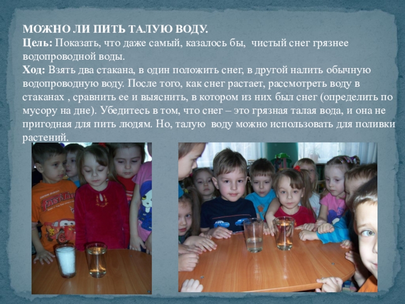 Ход: Взять два стакана, в один положить снег, в другой налить обычную водопроводную воду. После того, как снег растает, рассмотреть воду в стаканах , сравнить ее и выяснить, в котором из них был снег (определить по мусору на дне). Убедитесь в том, что снег – это грязная талая вода, и она не пригодная для пить людям. Но, талую  воду можно использовать для поливки растений.