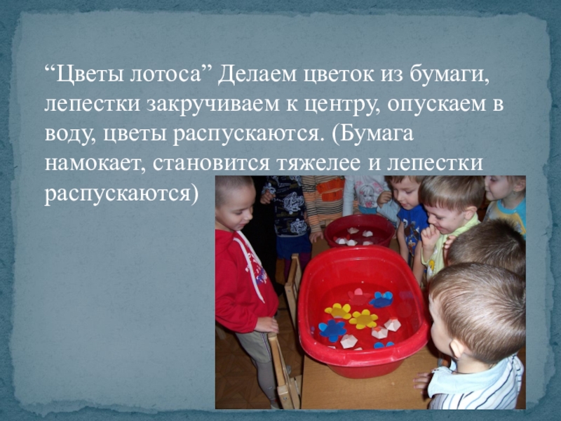 “Цветы лотоса” Делаем цветок из бумаги, лепестки закручиваем к центру, опускаем в воду, цветы распускаются. (Бумага намокает,