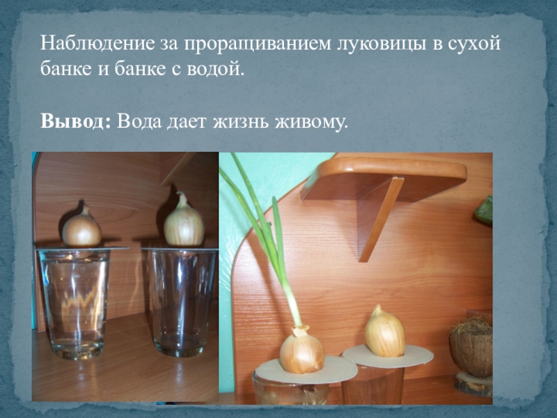 Наблюдение за проращиванием луковицы в сухой банке и банке с водой.Вывод: Вода дает жизнь живому.