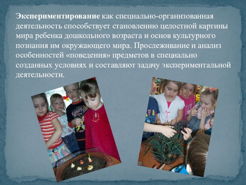 Слайд 9Экспериментирование как специально-организованная деятельность способствует становлению целостной картины мира ребенка дошкольного
