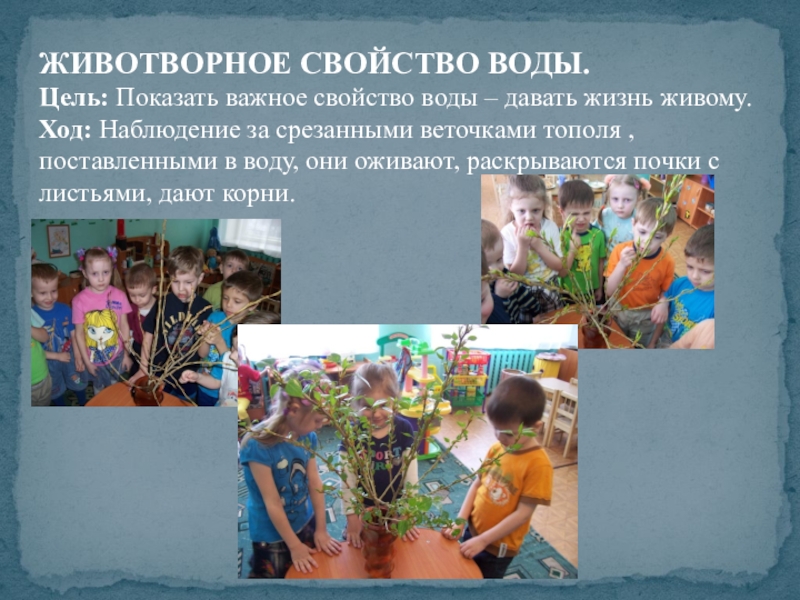 ЖИВОТВОРНОЕ СВОЙСТВО ВОДЫ. Цель: Показать важное свойство воды – давать жизнь живому.Ход: Наблюдение за срезанными веточками тополя