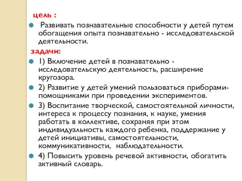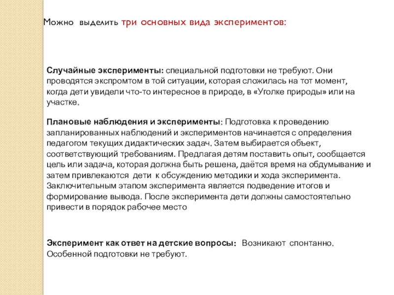 Плановые наблюдения и эксперименты: Подготовка к проведению запланированных наблюдений и экспериментов начинается с определения педагогом текущих дидактических задач. Затем выбирается объект, соответствующий требованиям. Предлагая детям поставить опыт, сообщается цель или задача, которая должна быть решена, даётся время на обдумывание и затем привлекаются дети к обсуждению методики и хода эксперимента. Заключительным этапом эксперимента является подведение итогов и формирование вывода. После эксперимента дети должны самостоятельно привести в порядок рабочее место