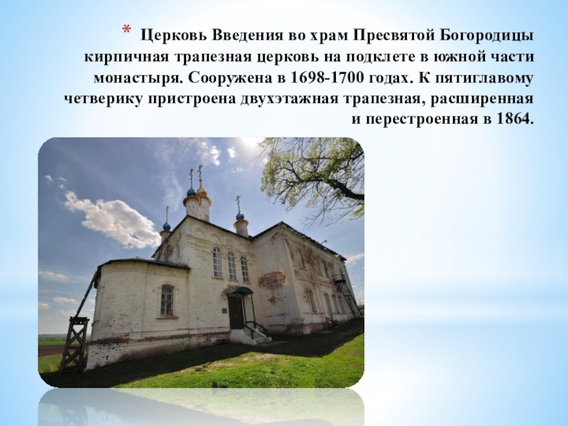 Слайд 33Церковь Введения во храм Пресвятой Богородицы кирпичная трапезная церковь на подклете
