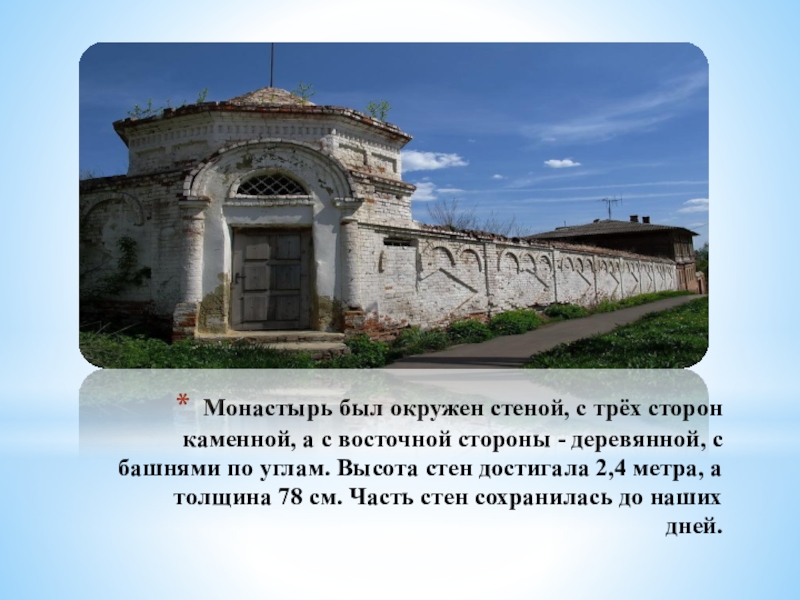 Слайд 15Монастырь был окружен стеной, с трёх сторон каменной, а с восточной