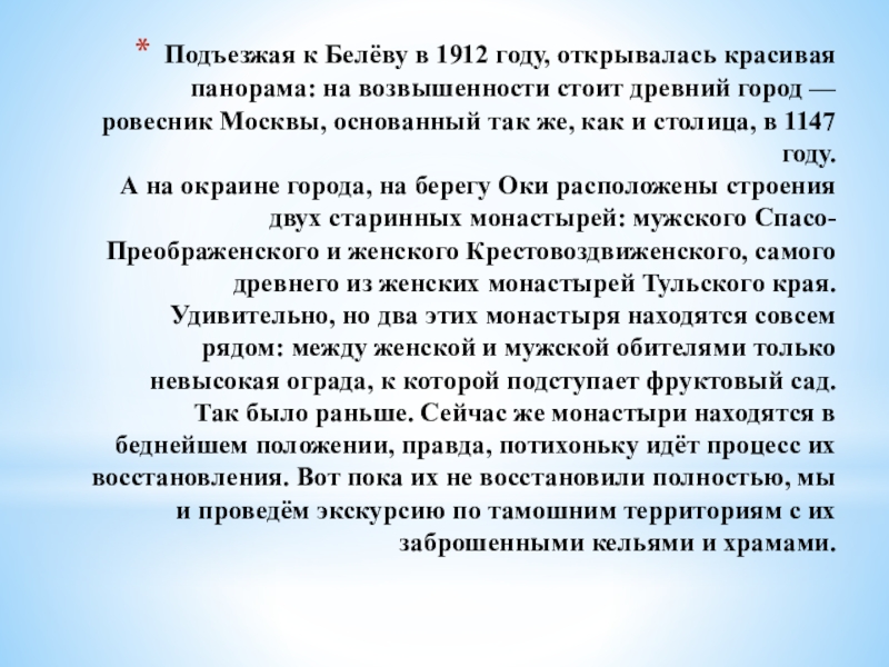 Слайд 2Подъезжая к Белёву в 1912 году, открывалась красивая панорама: на возвышенности