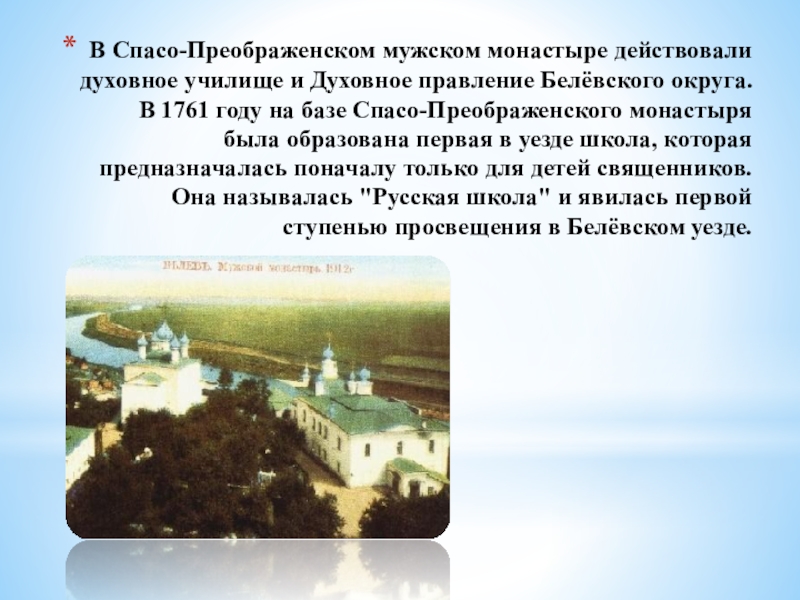 Слайд 34В Спасо-Преображенском мужском монастыре действовали духовное училище и Духовное правление Белёвского