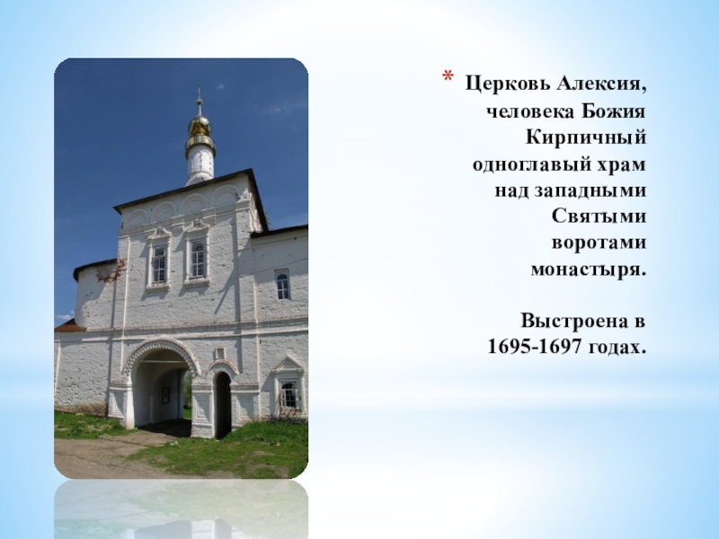 Слайд 35Церковь Алексия, человека Божия Кирпичный одноглавый храм над западными Святыми воротами