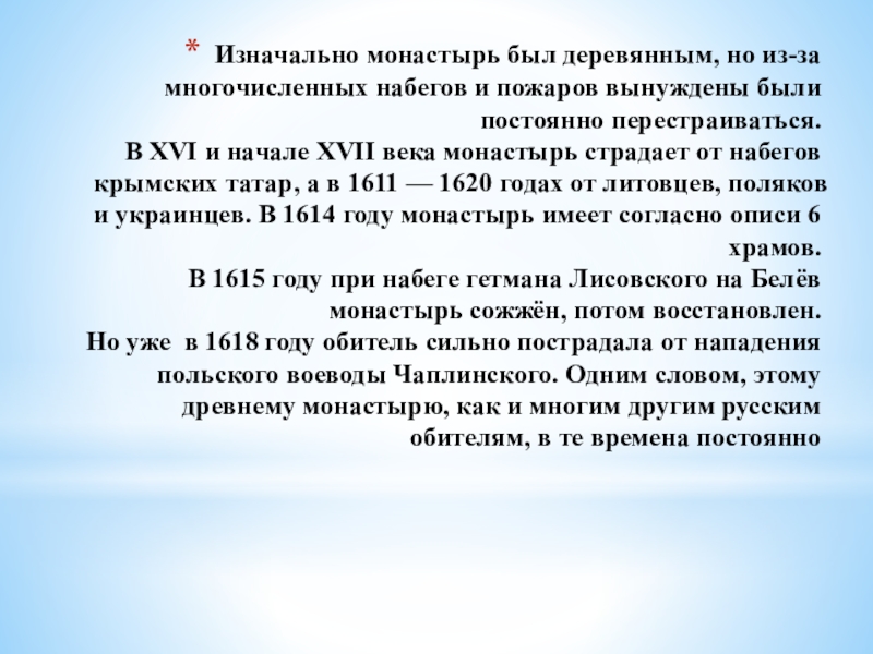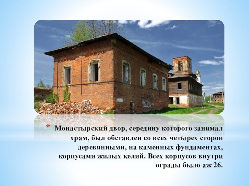 Слайд 28Изначально монастырь был деревянным, но из-за многочисленных набегов и пожаров вынуждены