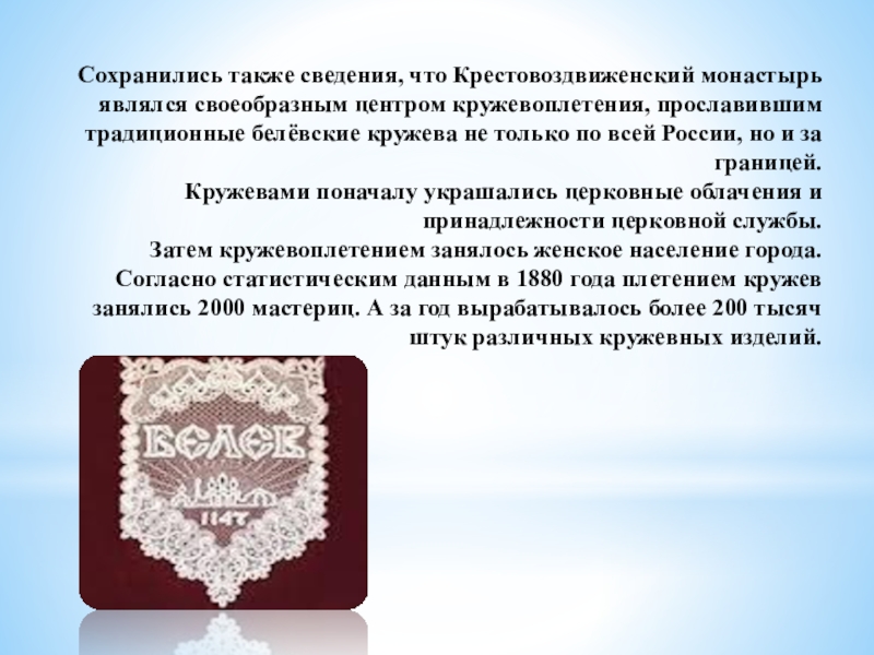 Сохранились также сведения, что Крестовоздвиженский монастырь являлся своеобразным центром кружевоплетения, прославившим