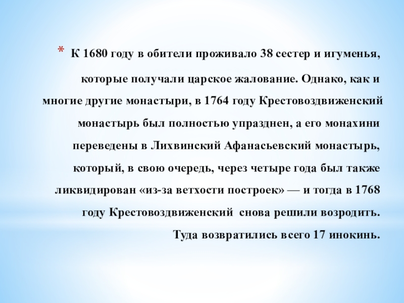 Слайд 8К 1680 году в обители проживало 38 сестер и игуменья, которые