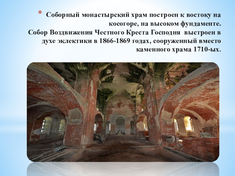 Слайд 12Соборный монастырский храм построен к востоку на косогоре, на высоком фундаменте.