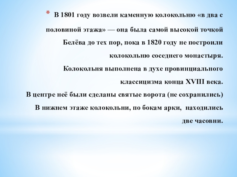 Слайд 17В 1801 году возвели каменную колокольню «в два с половиной этажа»