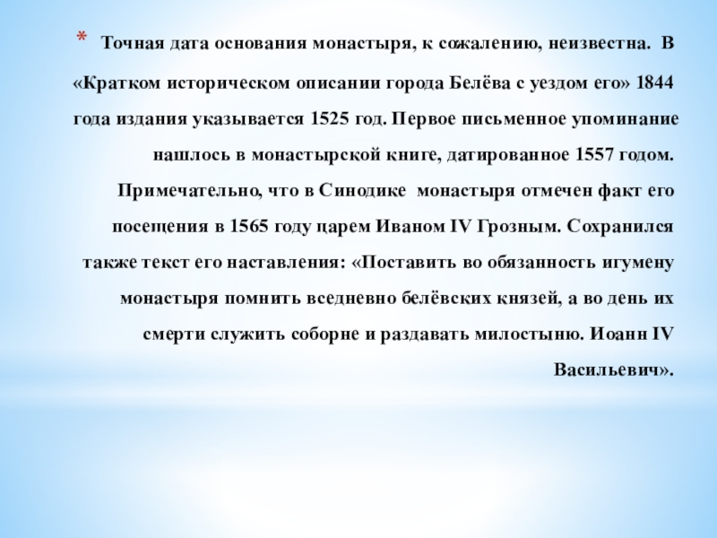 города Белёва с уездом его» 1844 года издания указываетcя 1525 год. Первое письменное упоминание нашлось в монастырской книге, датированное 1557 годом. Примечательно, что в Синодике монастыря отмечен факт его посещения в 1565 году царем Иваном IV Грозным. Сохранился также текст его наставления: «Поставить во обязанность игумену монастыря помнить вседневно белёвских князей, а во день их смерти служить соборне и раздавать милостыню. Иоанн IV Васильевич».