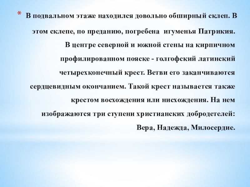 Слайд 13В подвальном этаже находился довольно обширный склеп. В этом склепе, по