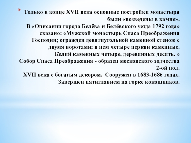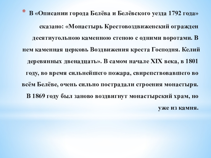 Слайд 10В «Описании города Белёва и Белёвского уезда 1792 года» сказано: «Монастырь