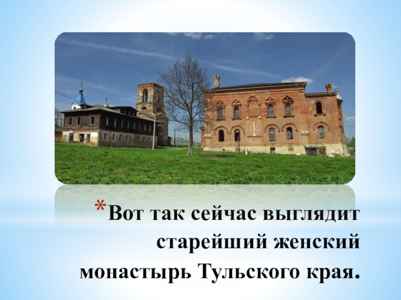 Слайд 4Вот так сейчас выглядит старейший женский монастырь Тульского края.