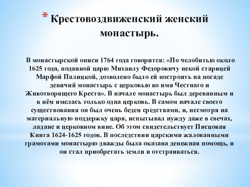 около 1625 года, поданной царю Михаилу Федоровичу некой старицей Марфой Палицкой, дозволено было ей построить на посаде девичий монастырь с церковью во имя Честнаго и Животворящего Креста». В начале монастырь был деревянным и в нём имелась только одна церковь. В самом начале своего существования он был очень беден средствами, и, несмотря на материальную поддержку царя, испытывал нужду даже в свечах, ладане и церковном вине. Об этом свидетельствует Писцовая Книга 1624-1625 годов. В последствии царскими жалованными грамотами монастырю дважды была оказана денежная помощь, и он стал приобретать земли и отстраиваться.