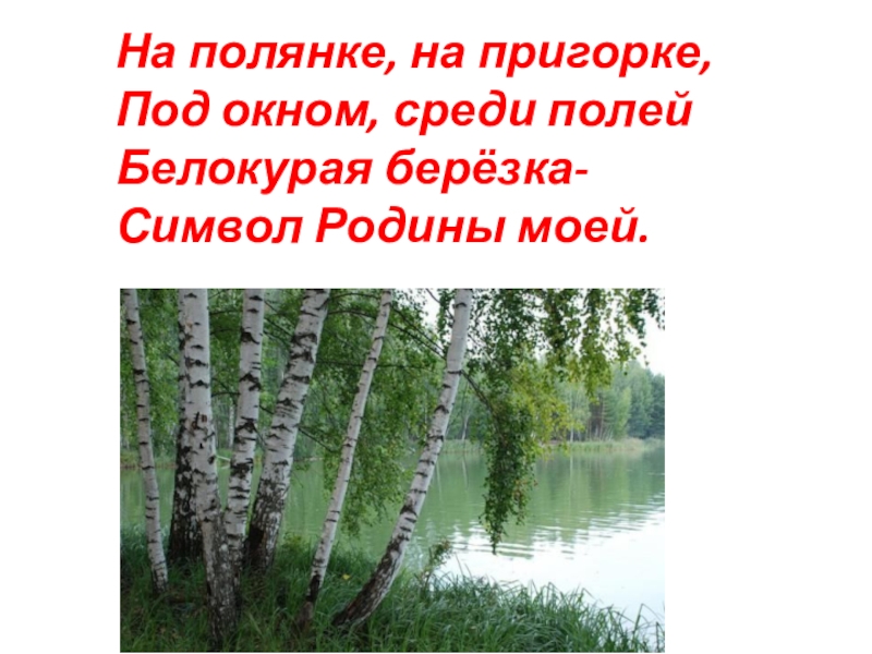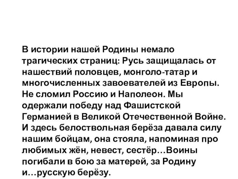 половцев, монголо-татар и многочисленных завоевателей из Европы. Не сломил Россию и Наполеон. Мы одержали победу над Фашистской Германией в Великой Отечественной Войне. И здесь белоствольная берёза давала силу нашим бойцам, она стояла, напоминая про любимых жён, невест, сестёр…Воины погибали в бою за матерей, за Родину и…русскую берёзу.