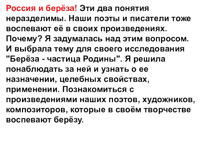 тоже воспевают её в своих произведениях. Почему? Я задумалась над этим вопросом. И выбрала тему для своего исследования "Берёза - частица Родины". Я решила понаблюдать за ней и узнать о ее назначении, целебных свойствах, применении. Познакомиться с произведениями наших поэтов, художников, композиторов, которые в своём творчестве воспевают берёзу.