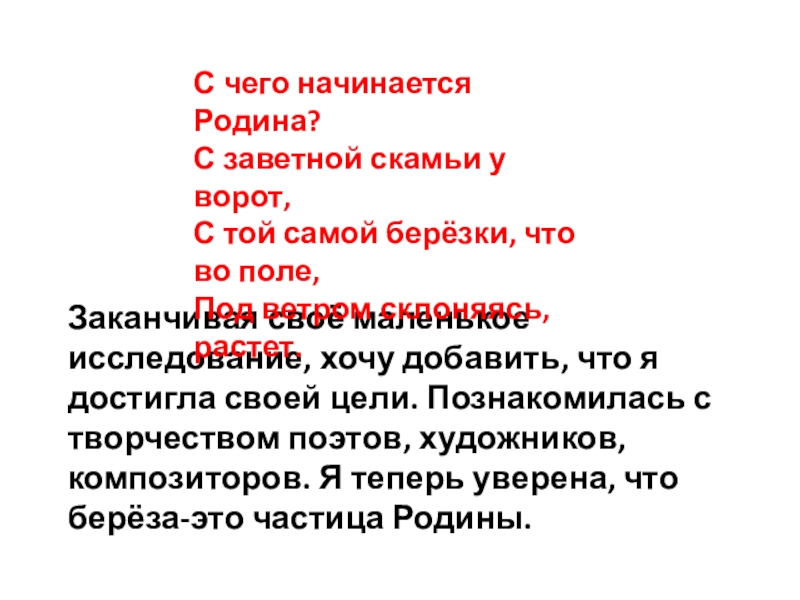 Познакомилась с творчеством поэтов, художников, композиторов. Я теперь уверена, что берёза-это частица Родины.