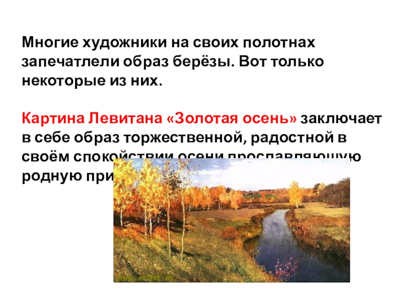 Картина Левитана «Золотая осень» заключает в себе образ торжественной, радостной в своём спокойствии осени прославляющую родную природу.