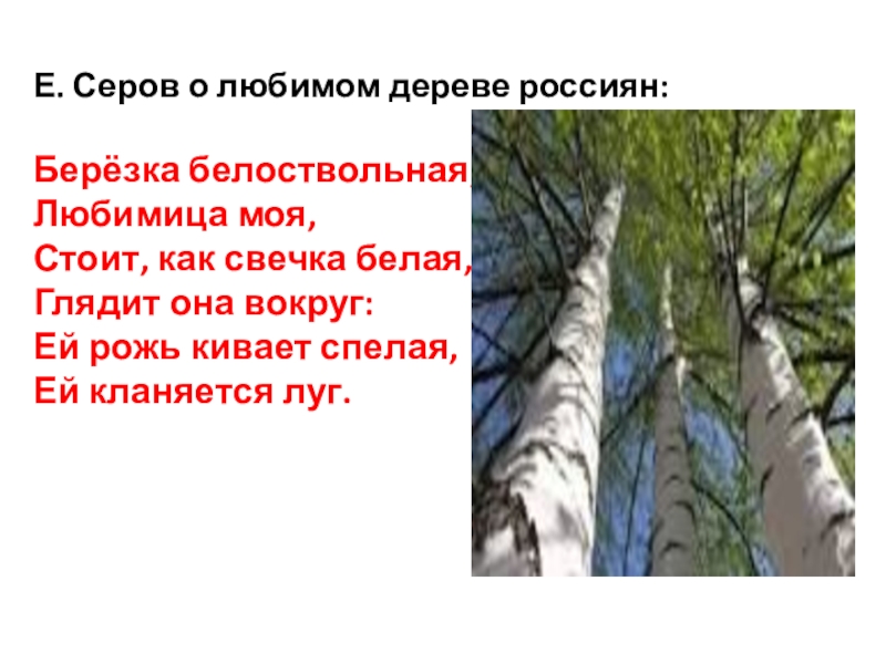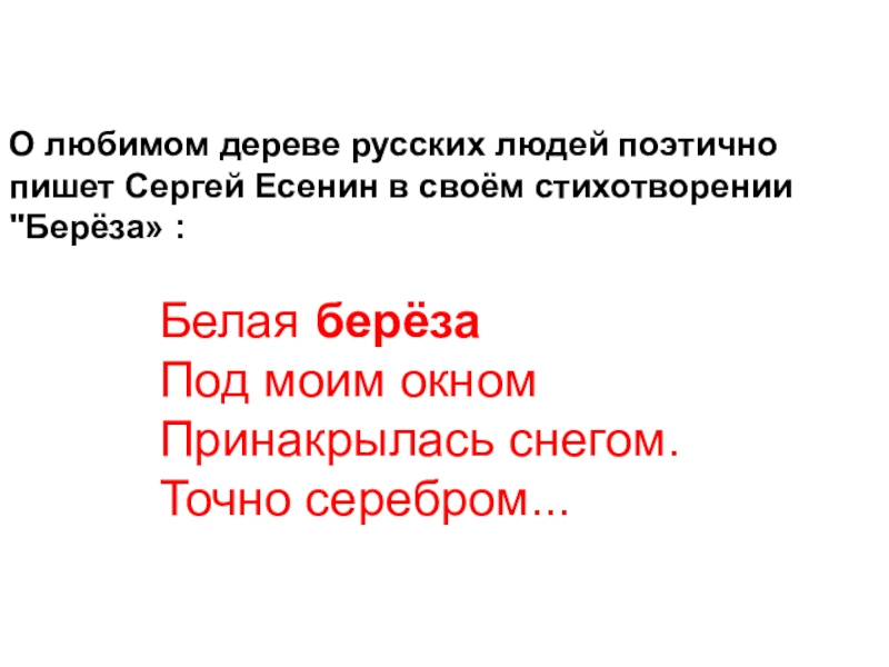 Слайд 14О любимом дереве русских людей поэтично пишет Сергей Есенин в своём