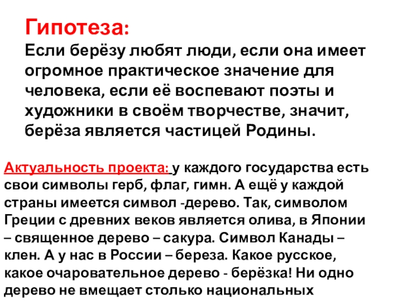 Актуальность проекта: у каждого государства есть свои символы герб, флаг, гимн. А ещё у каждой страны имеется символ -дерево. Так, символом Греции с древних веков является олива, в Японии – священное дерево – сакура. Символ Канады – клен. А у нас в России – береза. Какое русское, какое очаровательное дерево - берёзка! Ни одно дерево не вмещает столько национальных понятий, не рождает столько образов и сравнений.