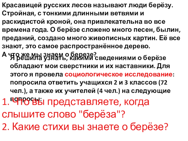 Слайд 12Я решила узнать, какими сведениями о берёзе обладают мои сверстники и