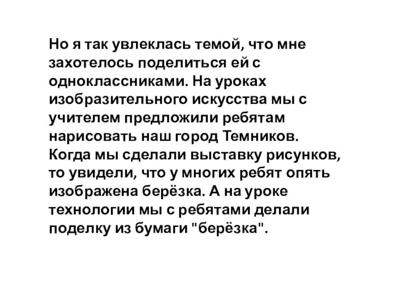одноклассниками. На уроках изобразительного искусства мы с учителем предложили ребятам нарисовать наш город Темников. Когда мы сделали выставку рисунков, то увидели, что у многих ребят опять изображена берёзка. А на уроке технологии мы с ребятами делали поделку из бумаги "берёзка".