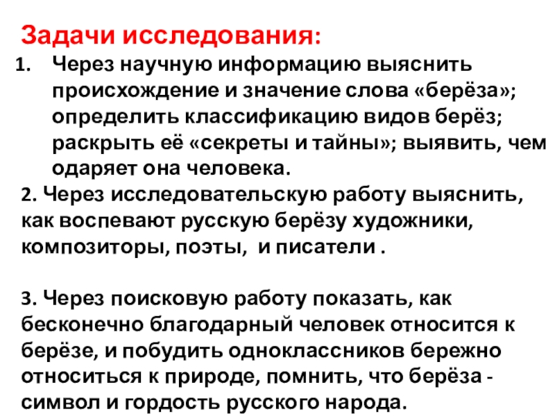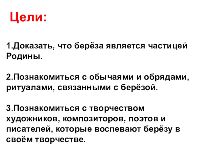 2. Через исследовательскую работу выяснить, как воспевают русскую берёзу художники, композиторы, поэты, и писатели .