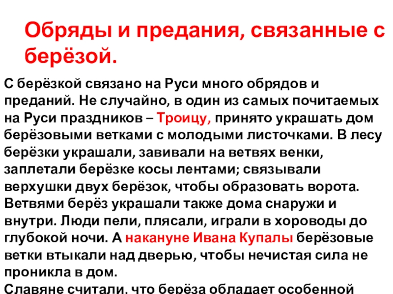 обрядов и преданий. Не случайно, в один из самых почитаемых на Руси праздников – Троицу, принято украшать дом берёзовыми ветками с молодыми листочками. В лесу берёзки украшали, завивали на ветвях венки, заплетали берёзке косы лентами; связывали верхушки двух берёзок, чтобы образовать ворота. Ветвями берёз украшали также дома снаружи и внутри. Люди пели, плясали, играли в хороводы до глубокой ночи. А накануне Ивана Купалы берёзовые ветки втыкали над дверью, чтобы нечистая сила не проникла в дом.