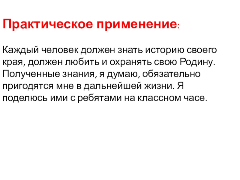 и охранять свою Родину. Полученные знания, я думаю, обязательно пригодятся мне в дальнейшей жизни. Я поделюсь ими с ребятами на классном часе.