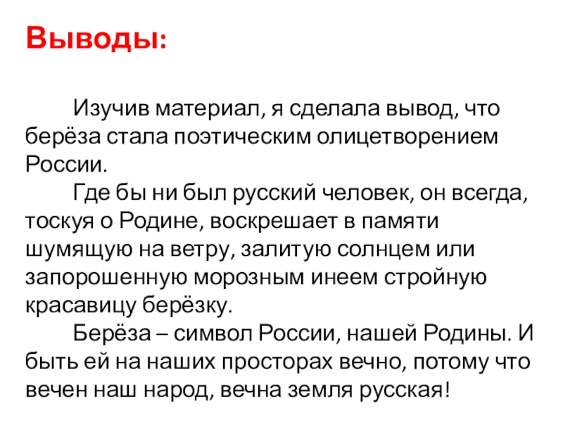 Берёза – символ России, нашей Родины. И быть ей на наших просторах вечно, потому что вечен наш народ, вечна земля русская!
