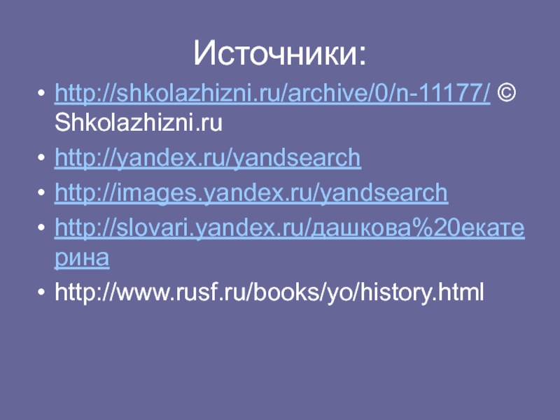 Источники:http://shkolazhizni.ru/archive/0/n-11177/ © Shkolazhizni.ruhttp://yandex.ru/yandsearchhttp://images.yandex.ru/yandsearchhttp://slovari.yandex.ru/дашкова%20екатеринаhttp://www.rusf.ru/books/yo/history.html