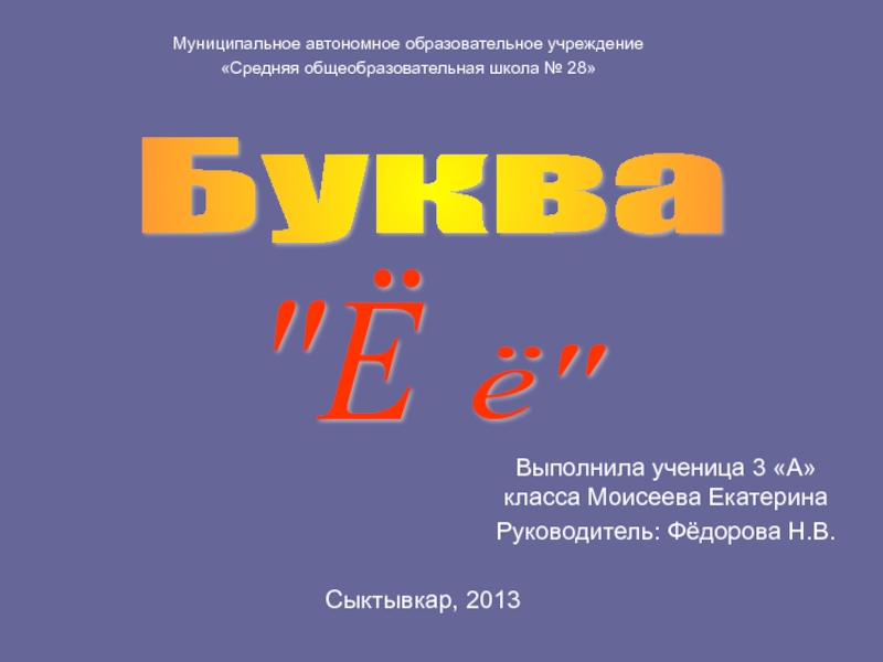 Презентация, доклад на тему Исследовательская работа Буква Ё ученицы 3 А класса МАОУ СОШ № 28 г. Сыктывкара