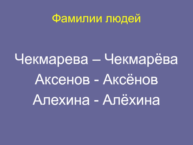 Фамилии людейЧекмарева – ЧекмарёваАксенов - АксёновАлехина - Алёхина