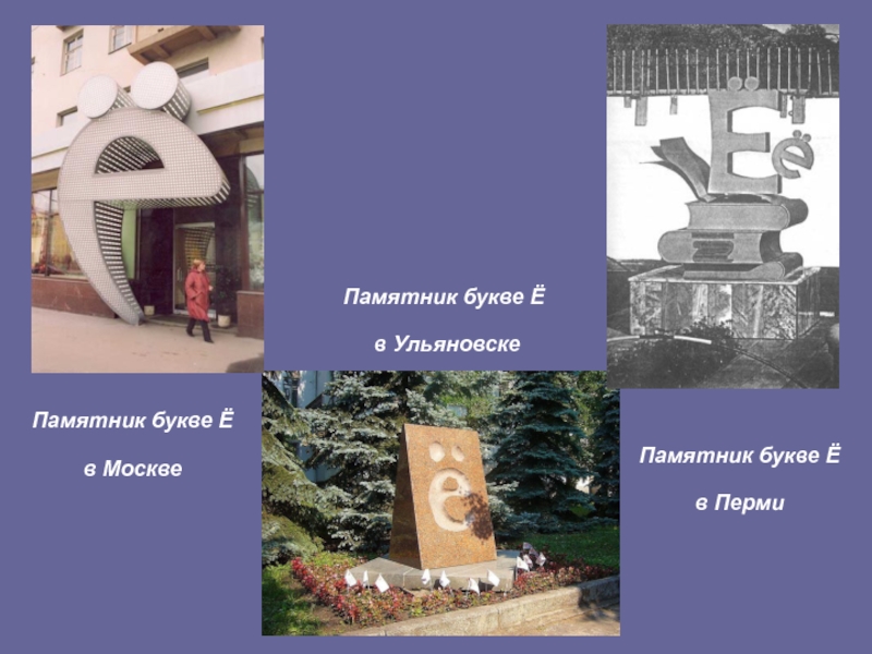 Памятник букве Ё в ПермиПамятник букве Ё в МосквеПамятник букве Ё в Ульяновске