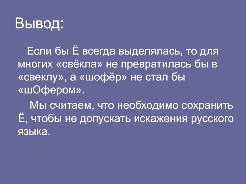 Вывод:   Если бы Ё всегда выделялась, то для многих «свёкла» не превратилась бы в «свеклу»,