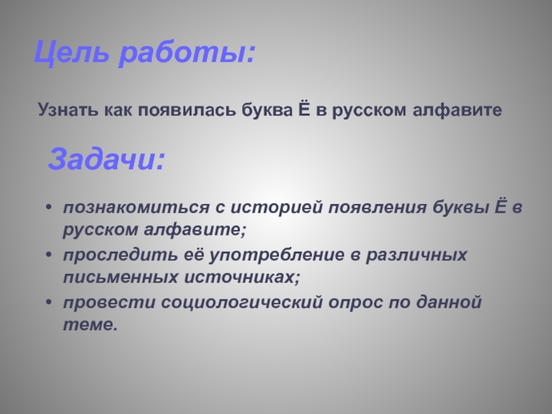 Цель работы:Узнать как появилась буква Ё в русском алфавитеЗадачи:познакомиться с историей появления буквы Ё в русском алфавите;проследить