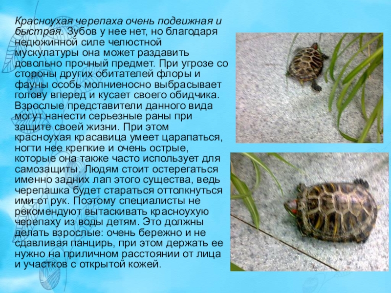 Слайд 7Красноухая черепаха очень подвижная и быстрая. Зубов у нее нет, но