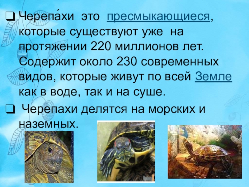 Слайд 4Черепа́хи это пресмыкающиеся, которые существуют уже на протяжении 220 миллионов лет.