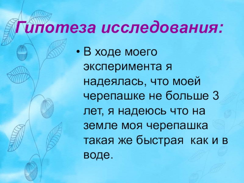 Гипотеза исследования: В ходе моего эксперимента я надеялась, что моей черепашке не больше 3 лет, я надеюсь