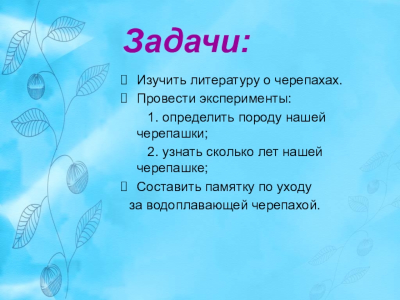 Задачи:Изучить литературу о черепахах.Провести эксперименты: 1. определить породу нашей черепашки; 2. узнать сколько лет нашей черепашке;Составить памятку по уходу за водоплавающей черепахой.