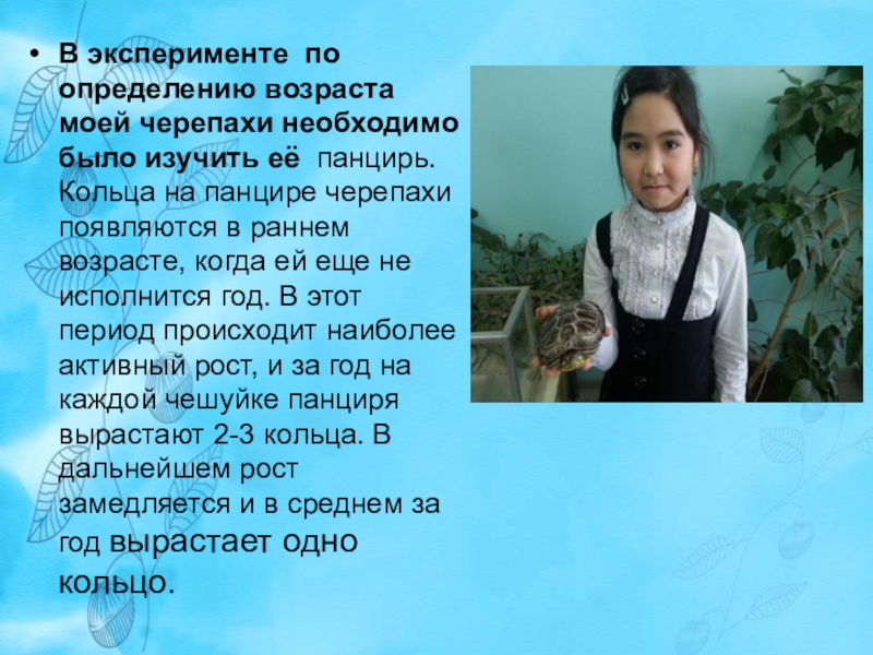 Слайд 6В эксперименте по определению возраста моей черепахи необходимо было изучить её