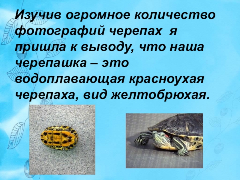 Слайд 5Изучив огромное количество фотографий черепах я пришла к выводу, что наша